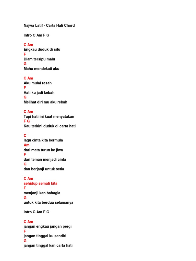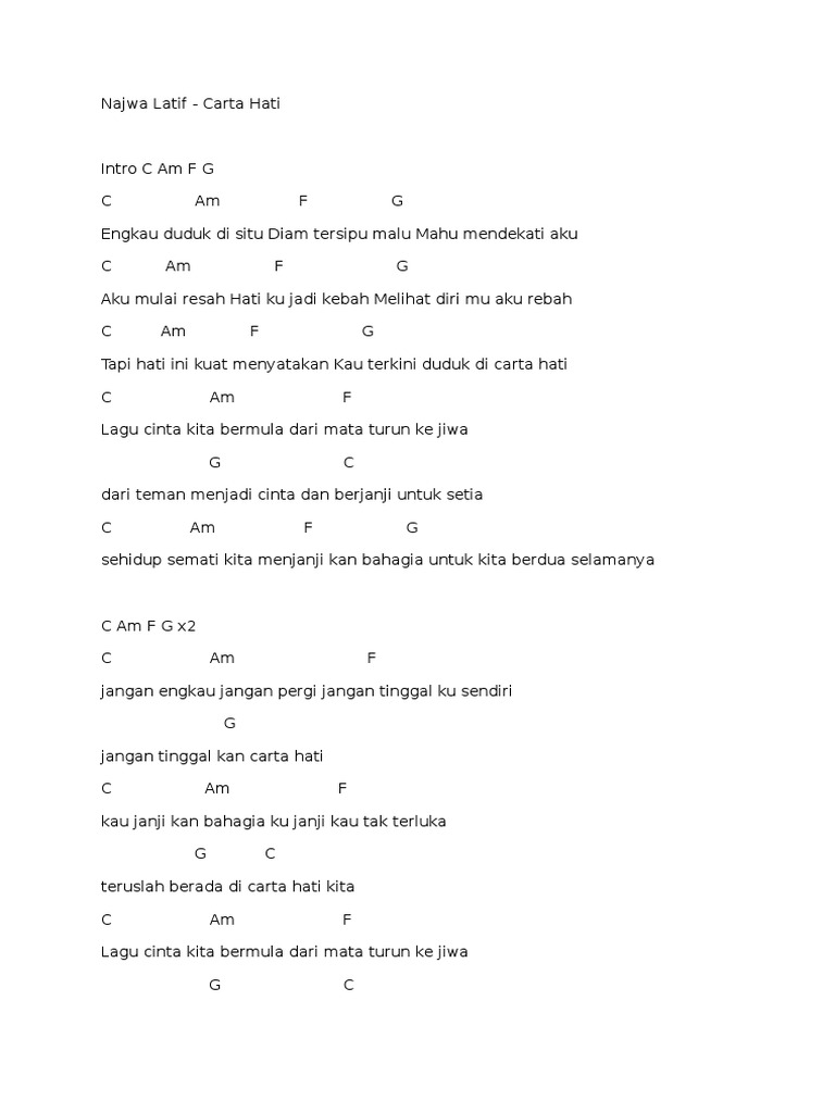 You can enjoy any kind of mp3. Najwa Latif - Carta Hati Chord - Malay Gitar Kord Tab Chords Easy Chord Lyrics. Lirik Lagu Carta Hati Najwa Latif Engkau duduk di situ Diam tersipu malu Mahu mendekati aku.