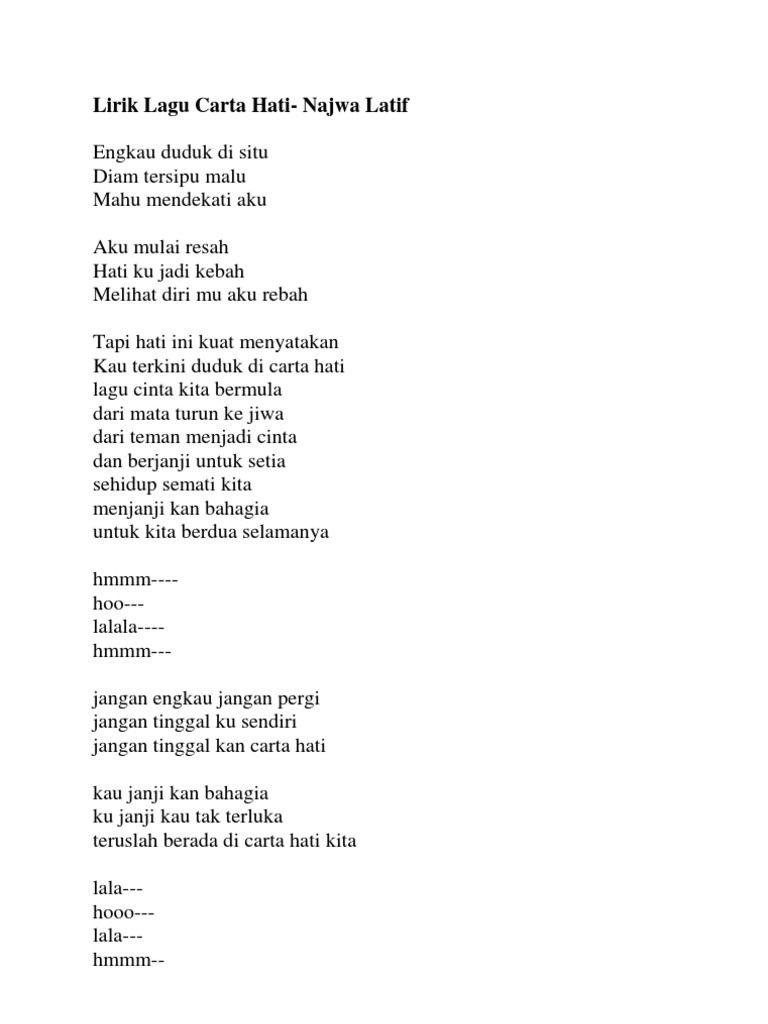 Jangan engkau jangan pergi jangan tinggal kusendiri jangan tinggalkan carta hati kau janjikan bahagia kujanji kau tak terluka teruslah berada di carta hati kita lalu cinta kita bermula dari mata. CARTA HATI - NAJWA LATIF MALAY SONGS. Aku cuba bertenang Walau hidup penuh tekanan Separuh jiwaku hilang Terbang melayang ke awan.